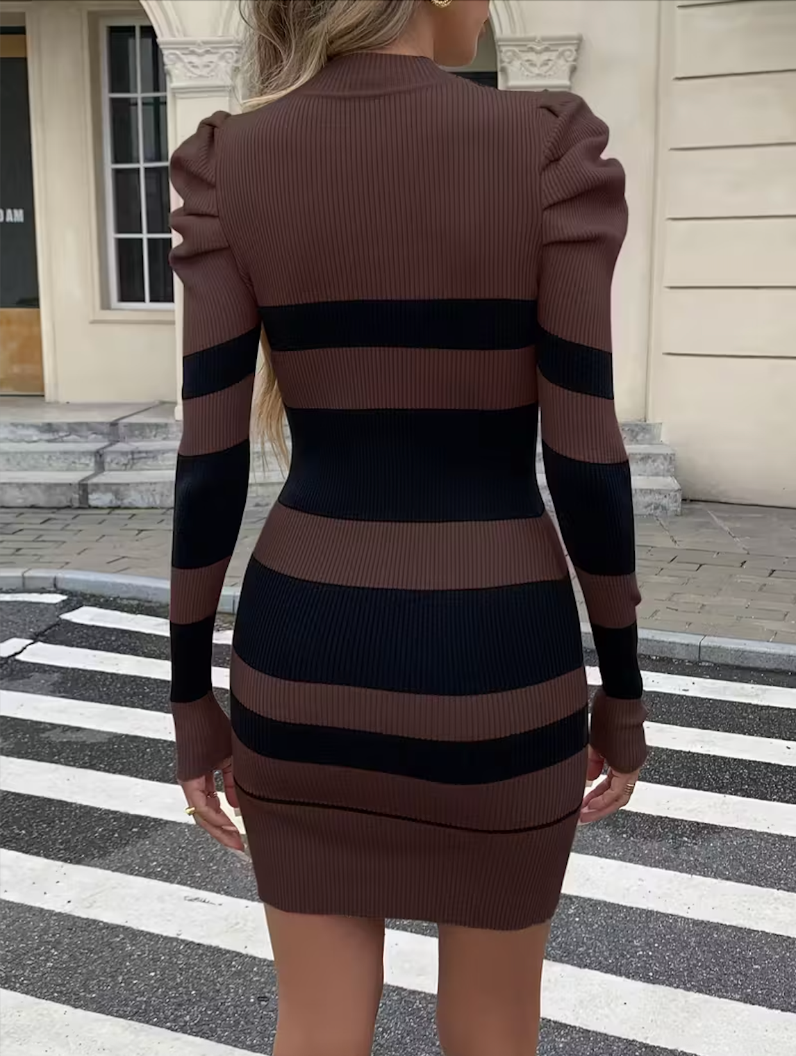 Le jeu de rayures marron et noir apporte une touche élégante et moderne, tandis que le col montant et les manches longues structurées ajoutent une finition sophistiquée.