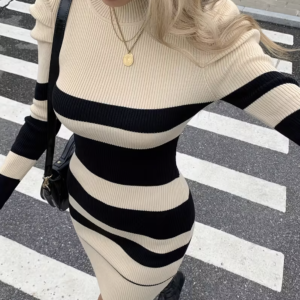 Robe pull moulante rayée beige & noir