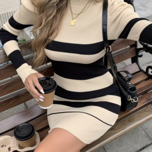 Sublimez votre silhouette avec cette robe pull côtelée à rayures. Sa coupe ajustée met en valeur les courbes, tandis que sa maille douce et extensible assure un confort absolu tout au long de la journée.