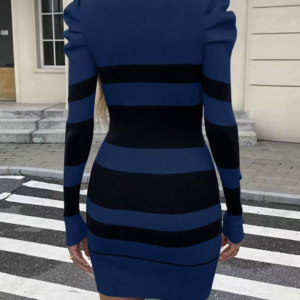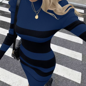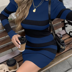 Robe en maille côtelée extensible, coupe moulante qui sublime la silhouette. Son col montant et ses manches longues apportent une touche chic et moderne. Motif à rayures bleu marine et noir, idéal pour un look tendance en toute saison.